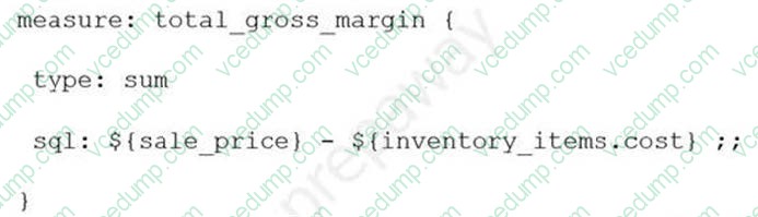 A. Join order_items and inventory_items in a derived table.A LookML developer builds a view that contains sensitive information. Only members of the Management group should have access to the view. The developer needs to restrict the view from appearing in the field picker for any Explore where it might be joined for users outside of the Management group.