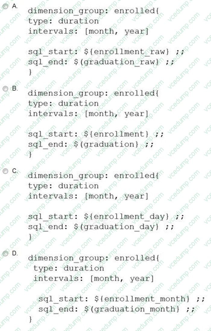A developer has the dimensions enrollment_month and graduation_month already defined in the view. Both were created as part of dimension_groups of type: time. The developer need to use these two dimensions in the sql_start and