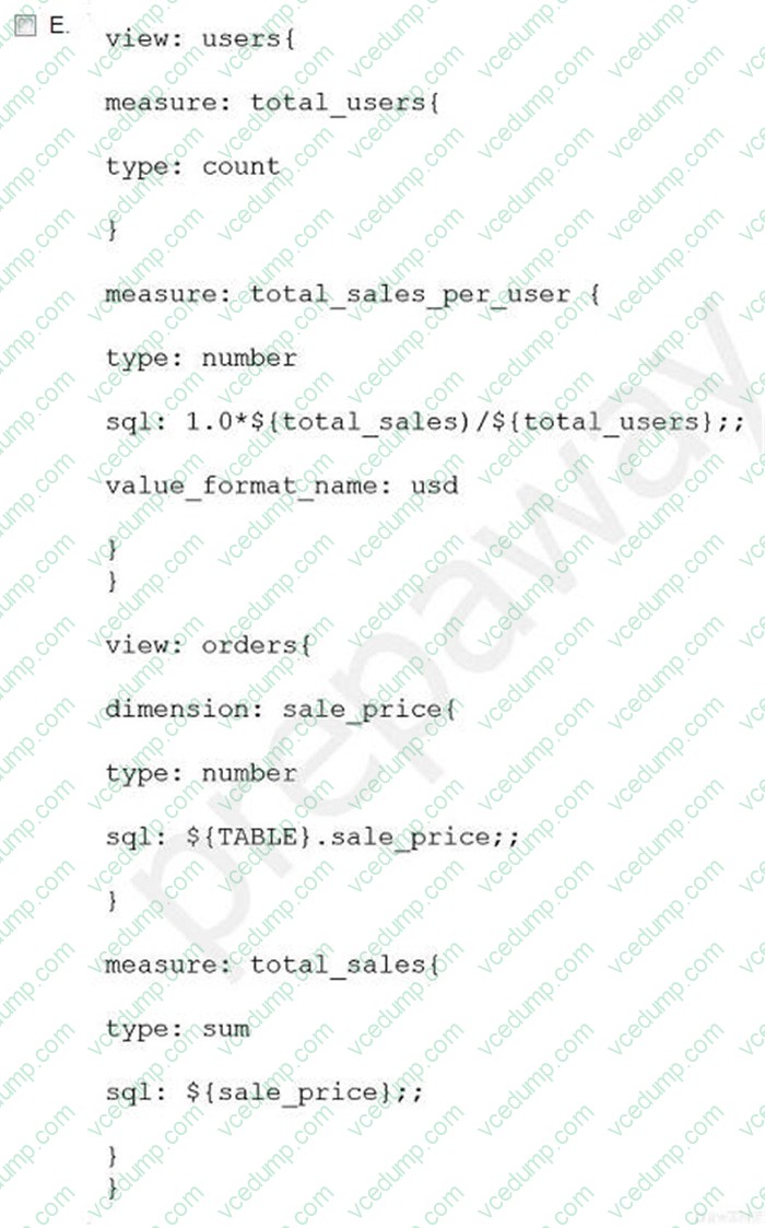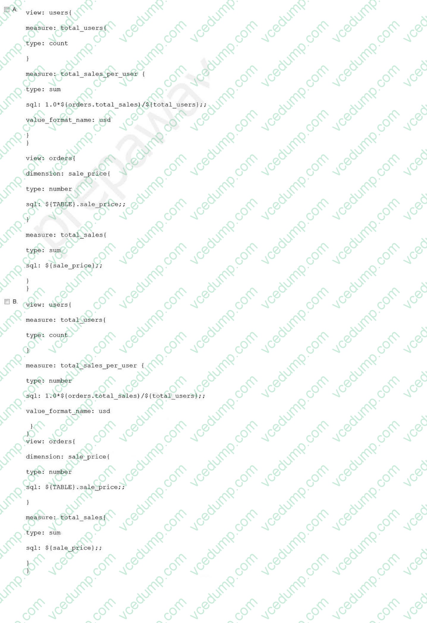 A. Week_start_dayA developer wants to calculate the ratio of total sales from the orders view and total users from the users view. Which two methods can be used to create a measure that meets these requirements? (Choose two.)