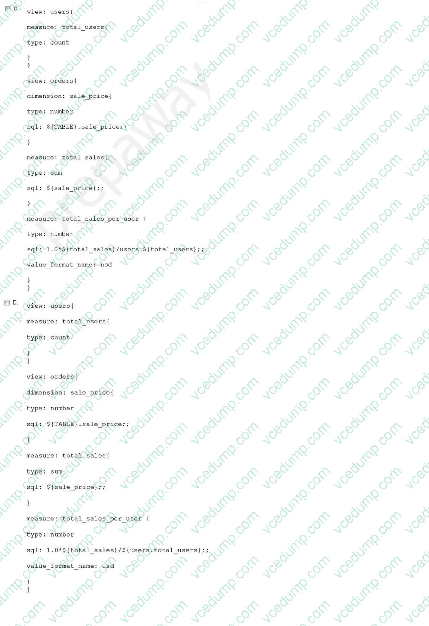 Nowadays, the certification exams become more and more important and required by more and more enterprises when applying for a job. But how to prepare for the exam effectively? How to prepare for the exam in a short time with less efforts? How to get a ideal result and how to find the most reliable resources? Here on Vcedump.com, you will find all the answers. Vcedump.com provide not only Google exam questions, answers and explanations but also complete assistance on your exam preparation and certification application. If you are confused on your LOOKML-DEVELOPER exam preparations and Google certification application, do not hesitate to visit our Vcedump.com to find your solutions here.