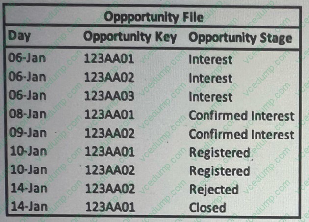 Given the above file and logic and assuming that the file is mapped in a GENERIC data stream type with the following mapping: "Day" -- Standard "Day" field "Opportunity Key" > Main Generic Entity Key "Opportunity Stage" -- Generic Entity key 2 A pivot table was created to present the count of opportunities in each stage. The pivot table is filtered on Jan 7th -11th.Which option reflects the stage(s) the opportunity key 123AA01 is associated with?