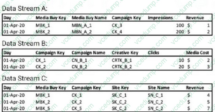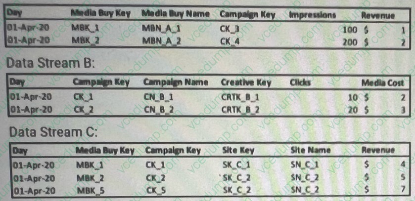 2. Out of the three data streams, Data Stream C is considered the source of truth for both the dimensions and measurements. Which data stream should be set as a parent?