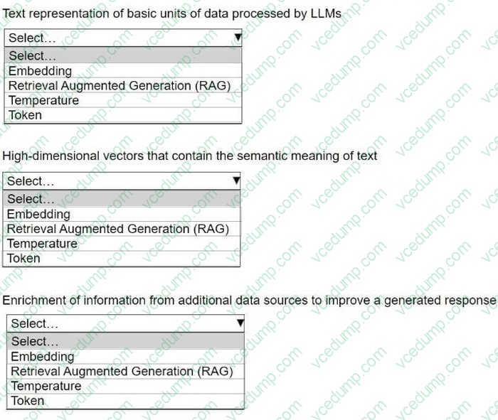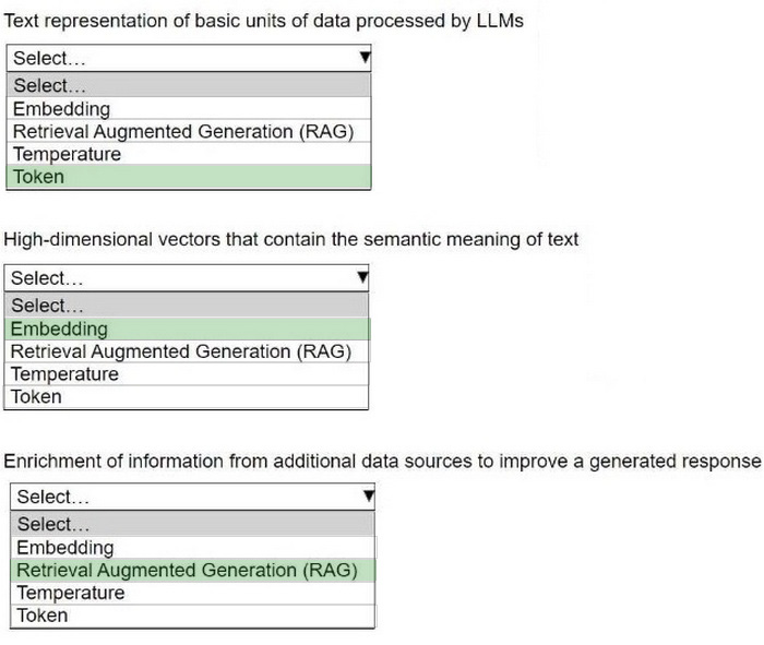 An ML engineer is building a generative AI application on Amazon Bedrock by using large language models (LLMs). Select the correct generative AI term from the following list for each description. Each term should be selected one time or not at all. (Select three.)