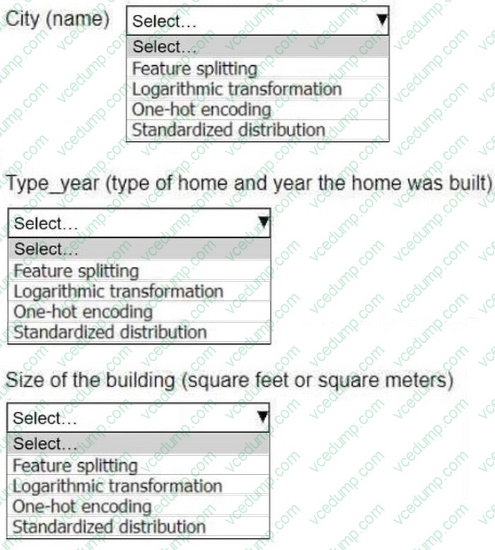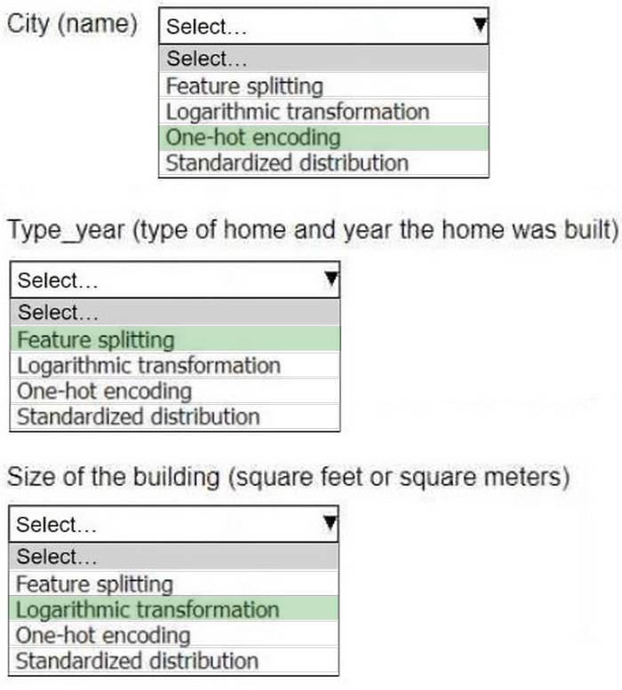 An ML engineer is working on an ML model to predict the prices of similarly sized homes. The model will base predictions on several features The ML engineer will use the following feature engineering techniques to estimate the prices of the homes: