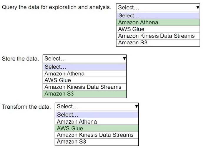 A company needs to train an ML model using historical transaction data to predict customer behavior. Choose the appropriate AWS service for each task related to handling this data. Each service should be selected only once or not at all.