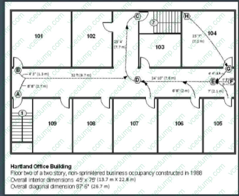 In the figure, what would be the minimum diagonal distance between Stairways 1 and 2?