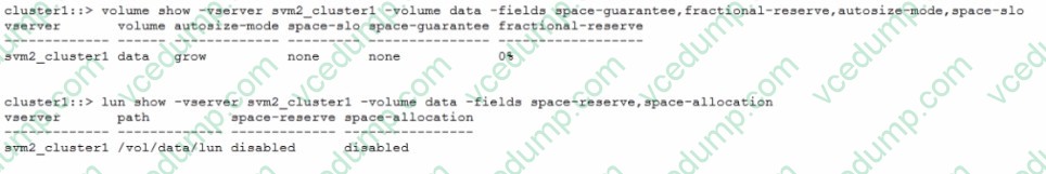 You have a 2-node NetApp FAS2750 ONTAP cluster. You create a new 20-GB LUN In a new 100-GB volume and write 10 GB of data to the LUN. No storage efficiencies are enabled for the volume or aggregate. Referring to the exhibit, which two statements are true? (Choose two.)