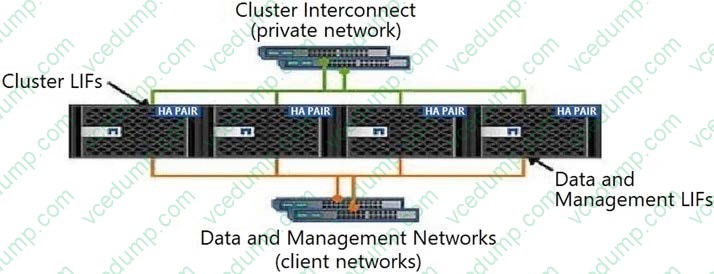 As shown in the exhibit, you have an 8-node ONTAP 9.7 cluster. You are asked to set up a SnapMirror volume relationship between node-1 and node-8 in the same cluster. In this scenario, which two network components are used by the SnapMirror volume? (Choose two.)