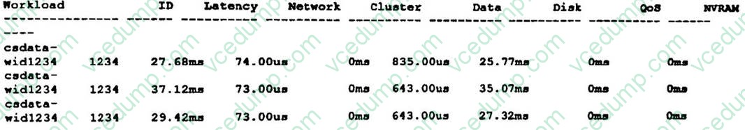 Users complain that they are experiencing problems accessing production data due to timeouts. You review the QoS output for a volume that handles the manufacturing production data. Referring to the exhibit, which command would help to identify the problem?