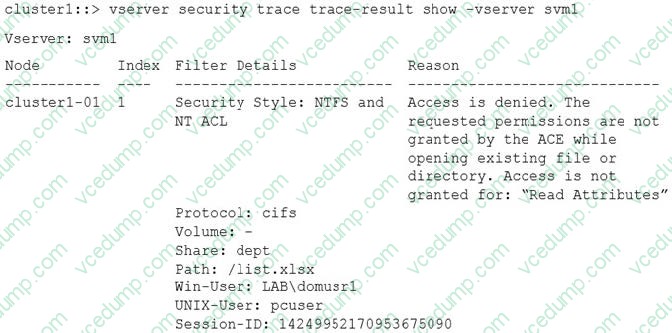 A. Replace disks 6b.34 and 6a.19.You perform a security trace when troubleshooting a data access problem for a user. The results are shown in the exhibit.