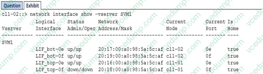 During pre-deployment testing, you want to ensure that all FC paths are available to your host. You use the network interface modify -vserver SVM1 -lif LIF_top-0f -admin-state up command to correct the configuration shown in the exhibit. What happens when using this command?