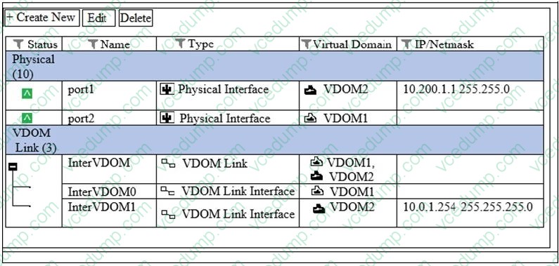 VDOM1 is operating in transparent mode VDOM2 is operating in NAT Route mode. There is an inteface VDOM link between both VDOMs. A client workstation with the IP address 10.0.1.10/24 is connected to port2. A web server with the IP
