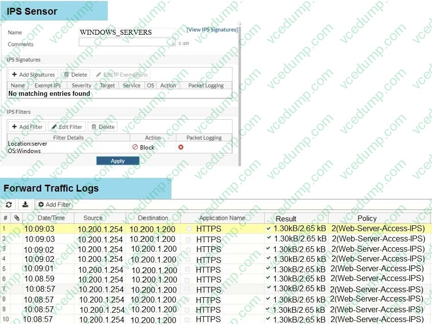 An administrator has configured the WINDOWS_SERVERS IPS sensor in an attempt to determine whether the influx of HTTPS traffic is an attack attempt or not. After applying the IPS sensor, FortiGate is still not generating any IPS logs for the HTTPS traffic.