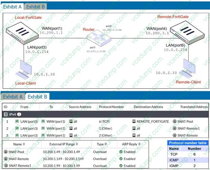 Which IP address will be used to source NAT (SNAT) the traffic, if the user on Local-Client (10.0.1.10) pings the IP address of Remote-FortiGate (10.200.3.1)?