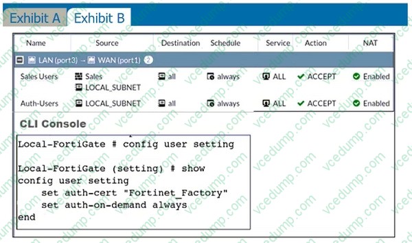 The exhibits contain a network interface configuration, firewall policies, and a CLI console configuration.