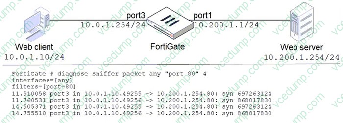 In the network shown in the exhibit, the web client cannot connect to the HTTP web server. The administrator runs the FortiGate built-in sniffer and gets the output shown in the exhibit.