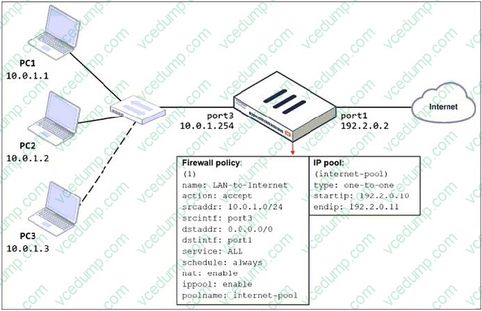 Two PCs, PC1 and PC2, are connected behind FortiGate and can access the internet successfully. However, when the administrator adds a third PC to the network (PC3), the PC cannot connect to the internet.