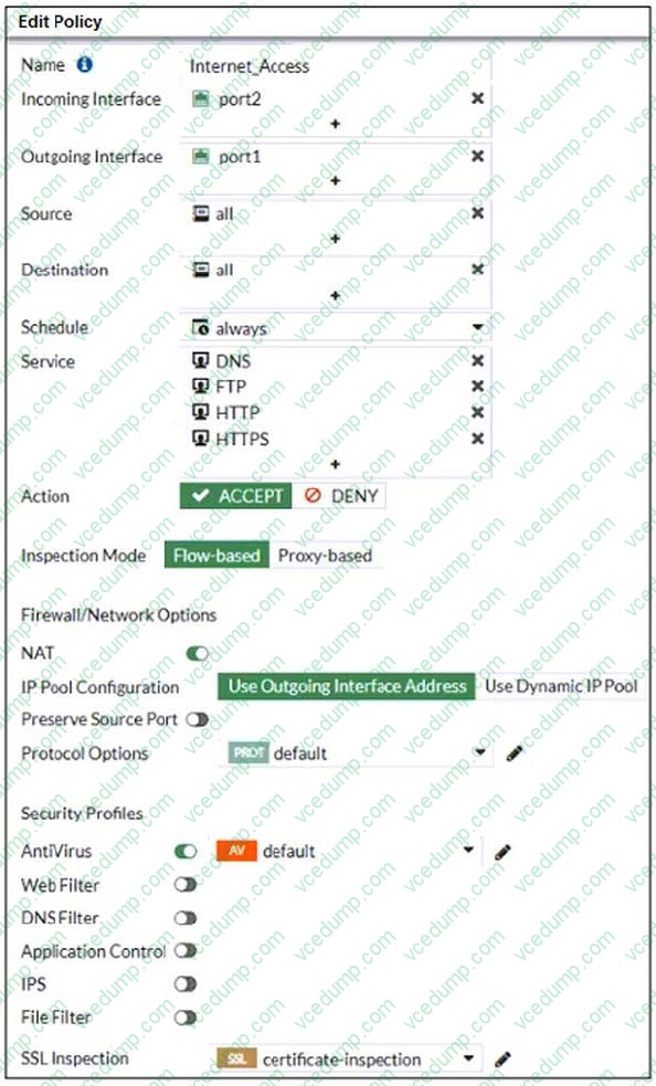 A. Web filter is not enabled on the firewall policy to complement the antivirus profile.Refer to the exhibit.