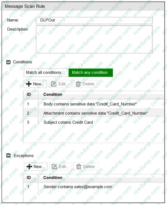 A. An email message with a subject that contains the term "credit card" will trigger this scan ruleWhile reviewing logs, an administrator discovers that an incoming email was processed using policy IDs 0:4:9. Which two scenarios will generate this policy ID? (Choose two.)