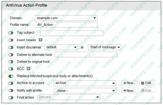 What are two expected outcomes if FortiMail applies this antivirus action profile to an email? (Choose two.)