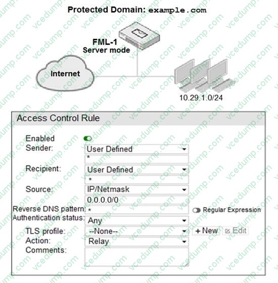 An administrator must enforce authentication on FML-1 for all outbound email from the example.com domain. Which two settings should be used to configure the access receive rule? (Choose two.)