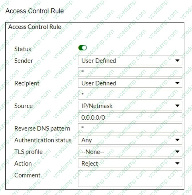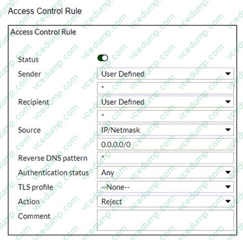 An administrator must enforce authentication on FML-1 for all outbound email from the example.com domain. Which two settings should be used to configure the access receive rule? (Choose two.)