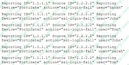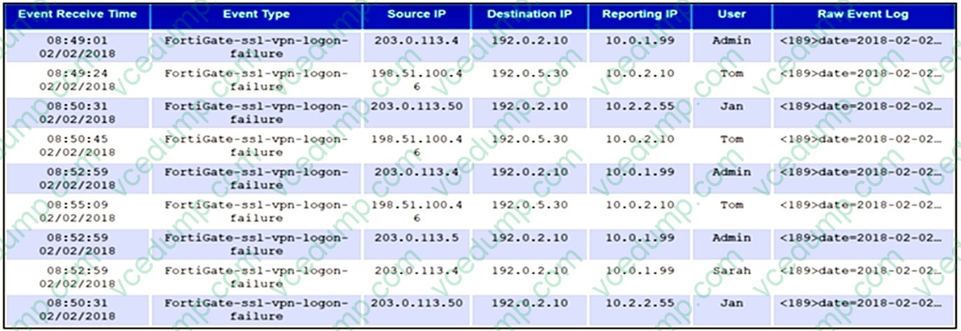 An administrator runs an analytic search for all FortiGate SSL VPN logon failures. The results are grouped by source IP, reporting IP, and user. The administrator wants to restrict the results to only those rows where the COUNT >= 3. Which user would meet that condition?