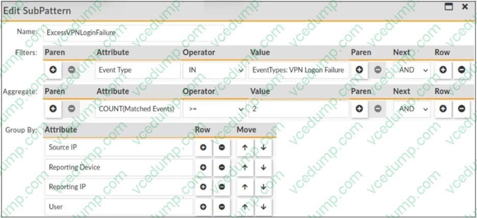 The rule evaluates multiple VPN logon failures within a ten-minute window. Consider the following VPN failure events received within a ten-minute window: