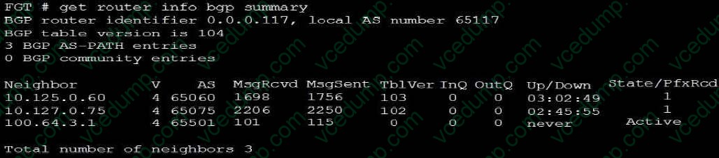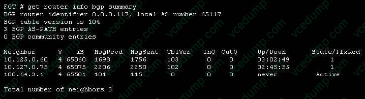 A. The local router's BGP state is Established with the 10.125.0.60 peer.Nowadays, the certification exams become more and more important and required by more and more enterprises when applying for a job. But how to prepare for the exam effectively? How to prepare for the exam in a short time with less efforts? How to get a ideal result and how to find the most reliable resources? Here on Vcedump.com, you will find all the answers. Vcedump.com provide not only Fortinet exam questions, answers and explanations but also complete assistance on your exam preparation and certification application. If you are confused on your NSE7_EFW-6.2 exam preparations and Fortinet certification application, do not hesitate to visit our Vcedump.com to find your solutions here.