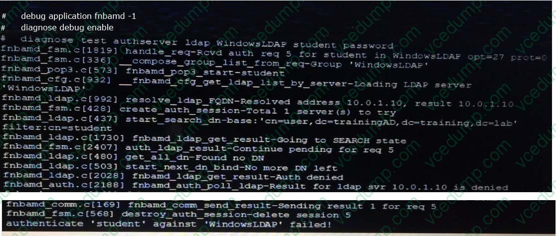 A. The link health monitor (if configured) is up.An LDAP user cannot authenticate against a FortiGate device. Examine the real time debug output shown in the exhibit when the user attempted the authentication; then answer the question below.