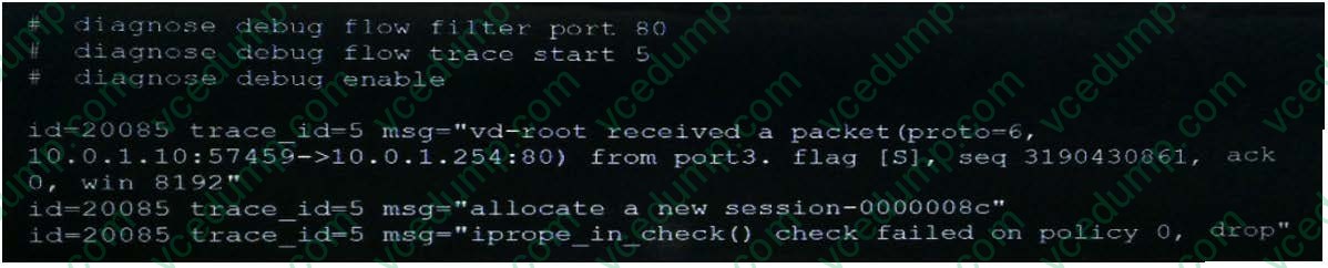 A. The user student must not be listed in the CA's ignore user list.An administrator cannot connect to the GIU of a FortiGate unit with the IP address 10.0.1.254. The administrator runs the debug flow while attempting the connection using HTTP. The output of the debug flow is shown in the exhibit: