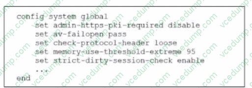 A. set strict-d^rty-session-check enable command instructs the FortiGate to offload all dirty session traffic to its SPU B. set check-protocol-header loose command enables hardware acceleration on this FortiGate device. C. set av-failopen pass command instructs the FortiGate to offload all traffic that uses the antivirus proxy to NP. D. set memory-use-threshoId-extreme command instructs the FortiGate to disable hardware acceleration if the memory extreme threshold reaches 95%