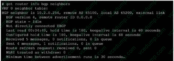 C. BGP is attempting to establish a TCP connection with the BGP peer. explanation: Explanation Explanation/Reference:The BGP state is "Idle", indicating that BGP is attempting to establish a TCP connection with the peer. This is the first state in the BGP finite state machine, and it means that no TCP connection has been established yet. If the TCP connection fails, the BGP state will reset to either active or idle, depending on the configuration.