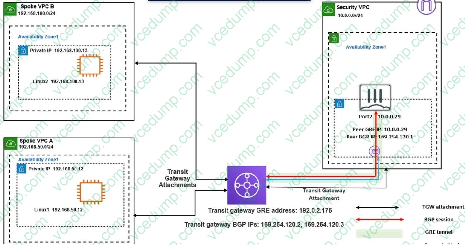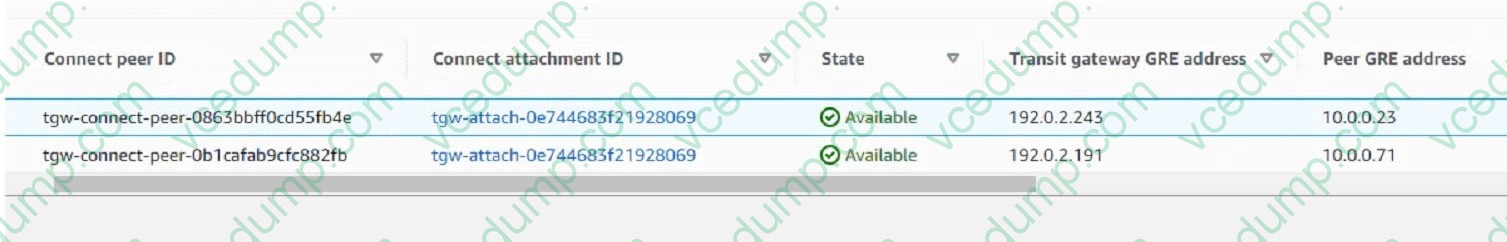 Refer to Exhibit: The exhibit shows the Connect Peers settings on Amazon Web Services (AWS) transit gateway attachments With two FortiGate VMS in a security VPC.