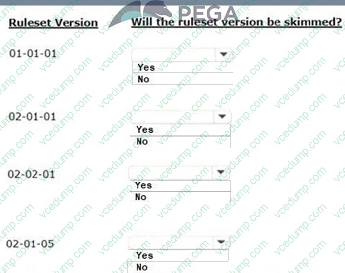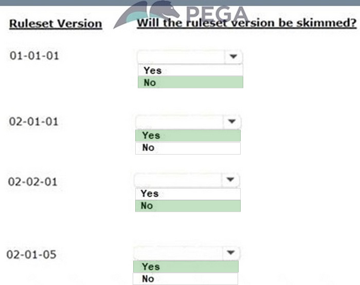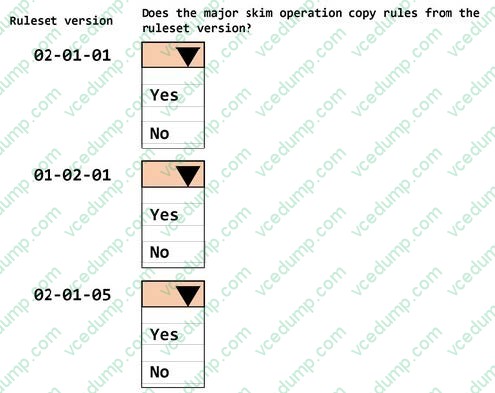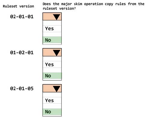 You perform a major skim on the ruleset ABC:02-02-01 to ABC:03-01-01. In the Answer area, select the ruleset versions that the skim operation uses to copy rules into ABC:03-01-01.