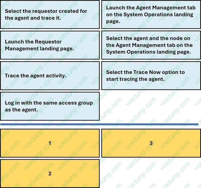 Select and move the three option that are required for tracing an agent on one of the nodes in a cluster to the step column and place them in the correct order