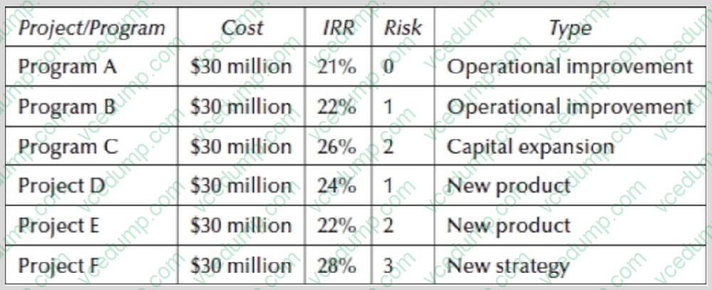 A. Organizational process assetsBased on the following table, assume you have been asked to perform a prioritization analysis based on these data. You realize risk is a major concern to the company, but you have some data available about potential benefits. These data show A and D have the greatest benefits. A and D are followed in terms of benefits by C, then B, then F, and finally Assume three of the programs and projects can be added to the portfolio when the Board meets. Your recommendation is to select: