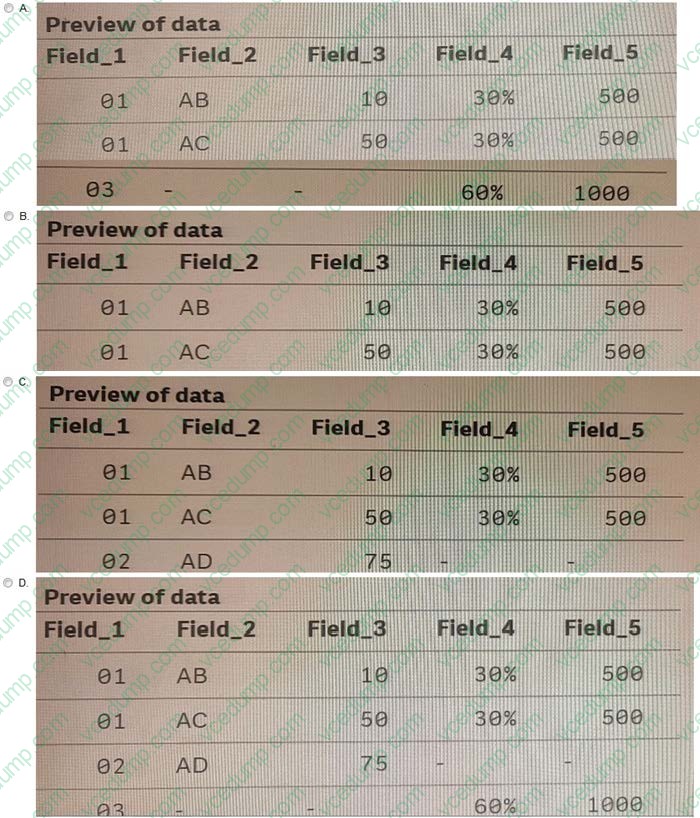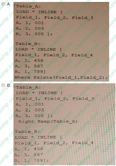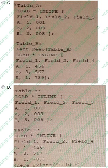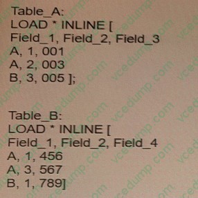 A data architect needs to modify the script to ONLY load rows from Table_B when Field_1 and Field_2 are the same as in Table_A. (For example, only the row containing A, 1, 456 should be loaded from Table_B.)