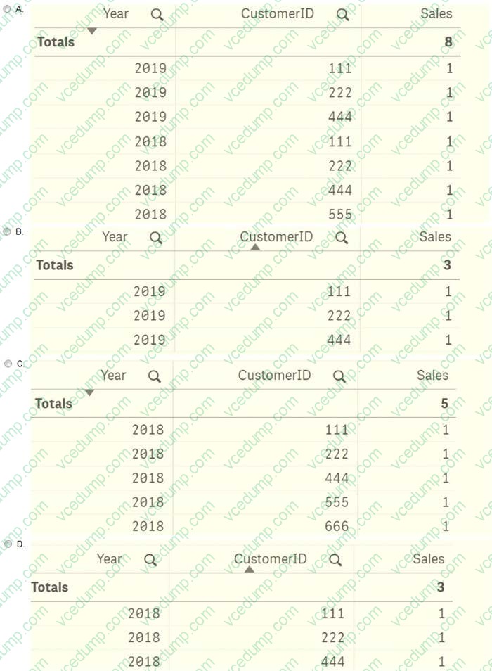 A data architect loads sales data and creates a table which shows only customers who made purchases in 2018 and 2019. The data architect applies the following set analysis expression on the sales measure. Count<{
