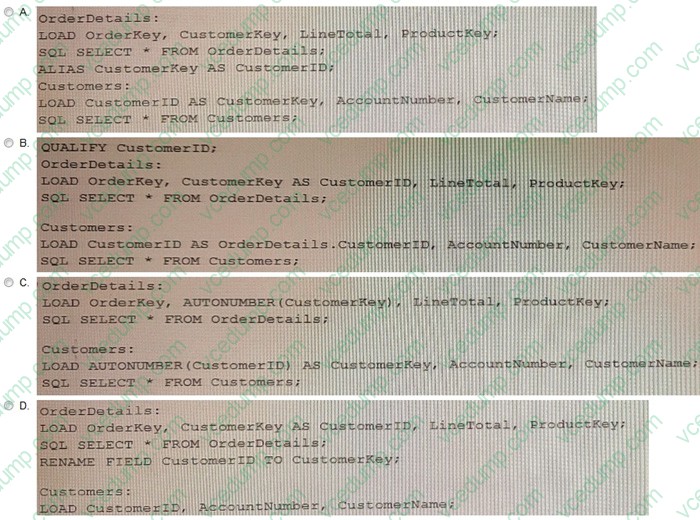 A data architect is loading two tables into a data model from a SQL database. These tables are related on key fields CustomerlD and CustomerKey. Which script is valid to load the tables and maintain the correct association?