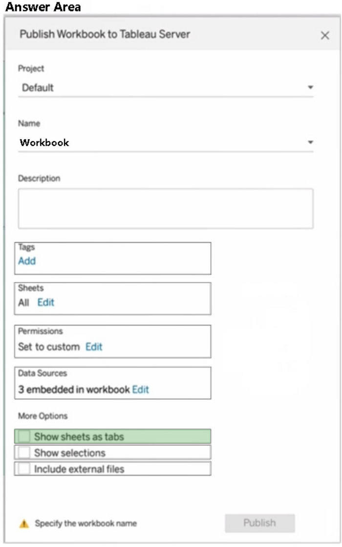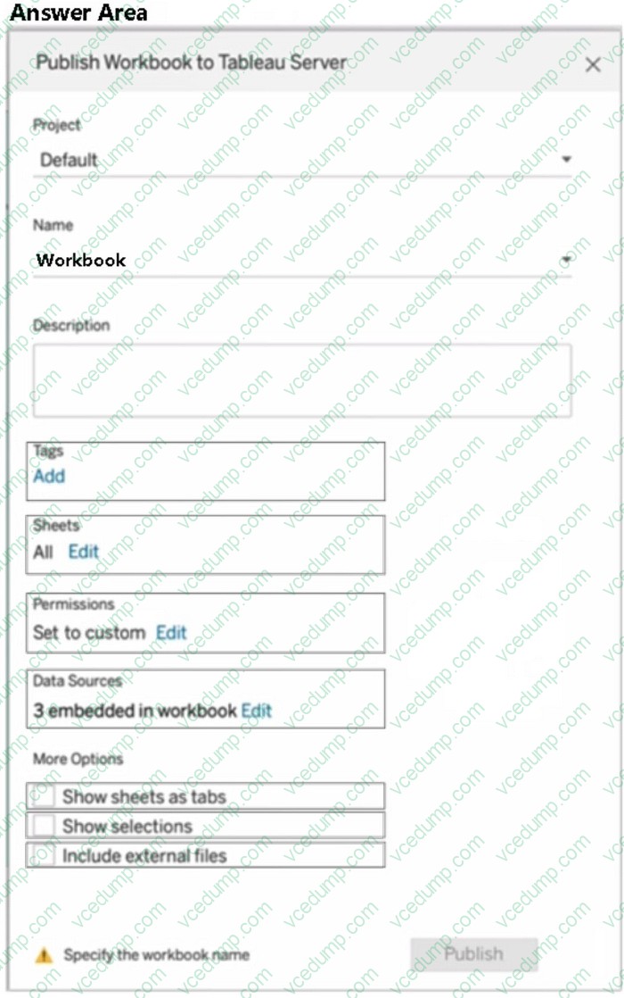 You plan to publish a workbook to Tableau Server.