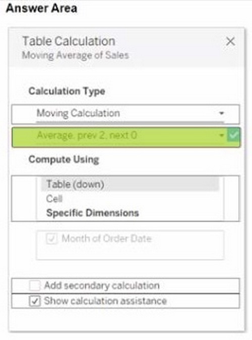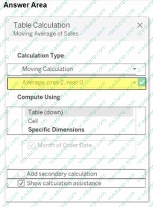 You use a quick table calculation lo calculate the moving average of a measure named Sales.