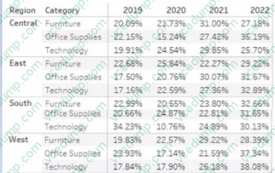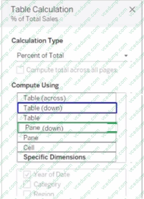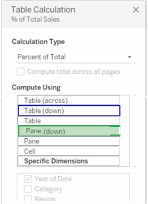 You want to change the calculation to show the percentage of total sales within the categories of every region annually. Which Compute Using option should you use? (Click the appropriate Option in the Answer Area.)