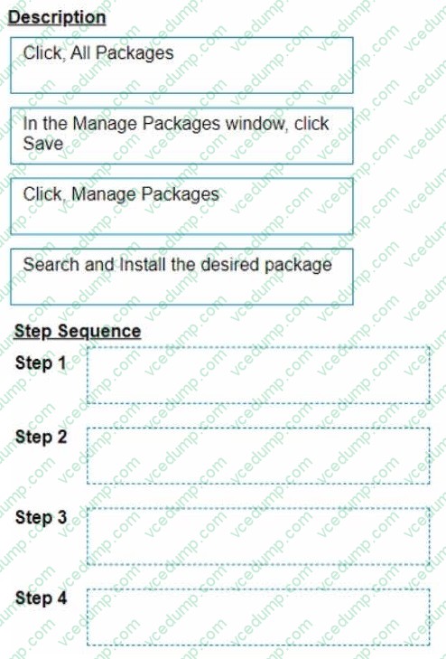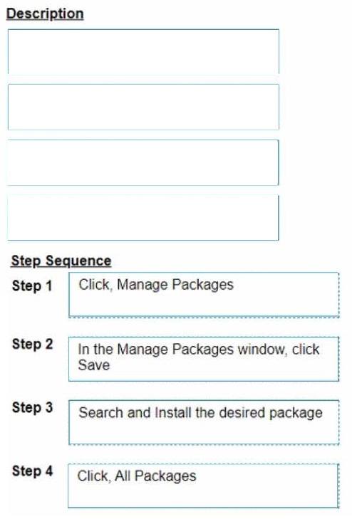 What is the correct sequence of steps to install a new Activities package in UiPath Studio 2021 10? Instructions: Drag the Description found on the left and drop on the correct Step found on the right.