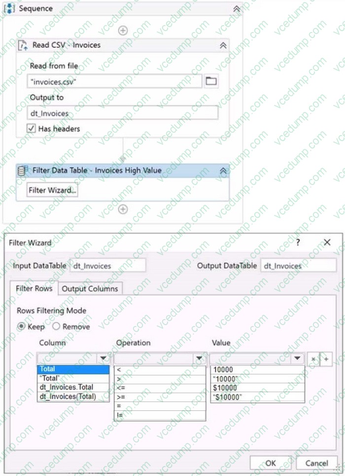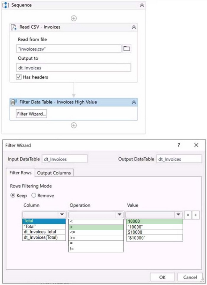 Instructions: Using the drop-down lists shown in the following exhibit, configure the Filter Data Table Wizard to keep all invoices with a Total value that is over 10 000 USD.