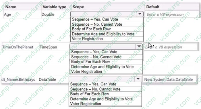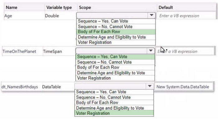 Instructions: Based on best practices, select the correct Scope for each Variable type from the drop-down lists shown in the following exhibit.