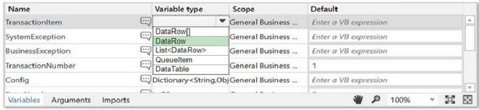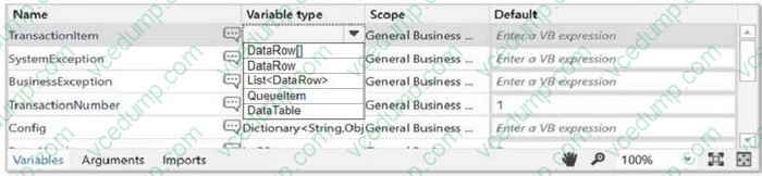 Instructions: Choose the appropriate variable type for the Transactionltem from the provided drop-down list in the following exhibit.